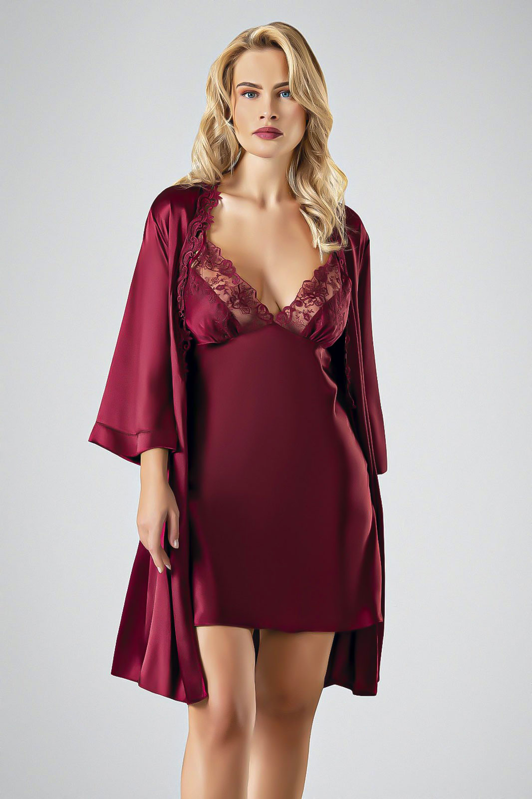 Gecelerinize derinlik ve asalet katacak bu bordo gecelik takımı ile tüm gözleri üzerinize çekin. İpeksi saten kumaşın zengin bordo tonu, lüks bir parlaklıkla vücudunuzu sararak çarpıcı bir silüet yaratır. Geceliğin V yakasından başlayıp dekolteyi süsleyen karmaşık floral dantel işlemeleri, tasarıma gizemli ve feminen bir hava katar. Yan yırtmaçtaki narin dantel şerit detayı ise tasarıma ekstra bir çekicilik katıyor. Rahat kesimli ve üç çeyrek kol boyundaki uyumlu saten sabahlık, takımı tamamlayarak hem konfor hem de ihtişam sunar. Bu takımla kendinizi güçlü, sofistike ve tamamen karşı konulmaz hissedeceksiniz.
