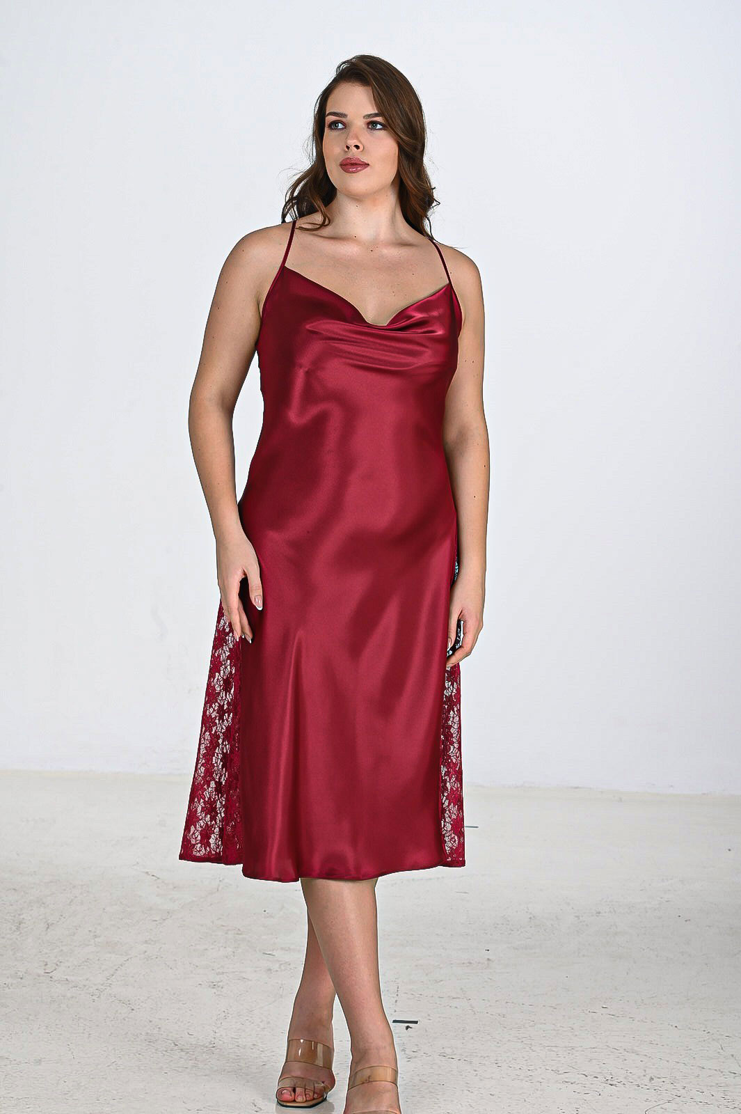 Gecenin büyüsüyle tutkunun rengini üzerinizde taşıyın! Büyük beden kadınlar için tasarlanan bu midi boy diz altı gecelik, klasik şıklığı modern çekicilikle buluşturuyor. Canlı kırmızı saten kumaşın ipeksi dokusu, vücudunuzda zarifçe süzülürken lüks bir his yaratır. Tasarımın odak noktası, göğüs altındaki ve yanlardaki narin dantel panellerdir; bu şeffaf detaylar, modele gizemli ve baştan çıkarıcı bir hava katıyor. Geceliğin yanındaki zarif yırtmaç, hareket özgürlüğü sağlarken bacaklarınızı narin bir şekilde ortaya çıkarır. kendinizi muhteşem hissetmeniz için tasarlandı.