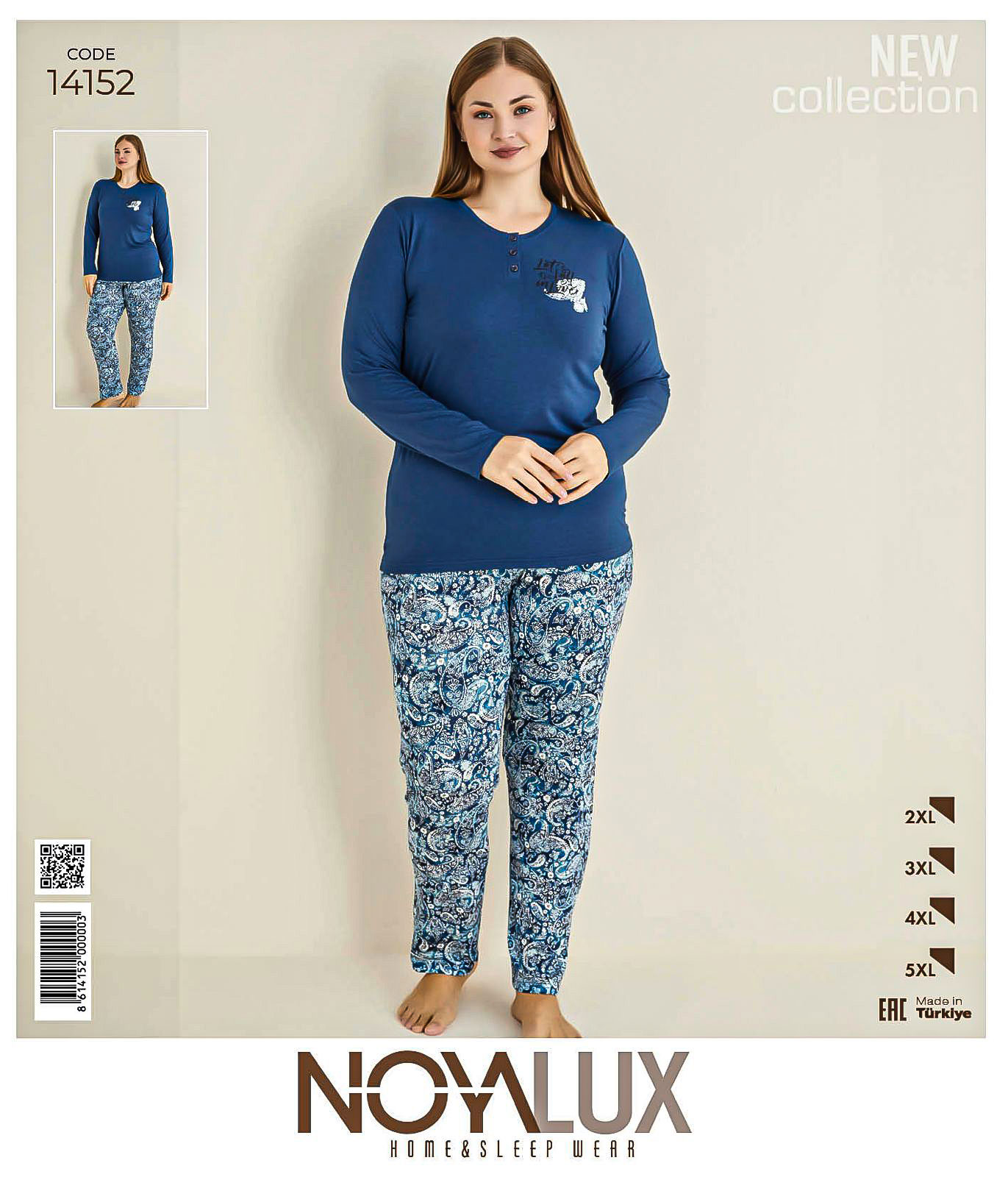 Noya 14152 Büyük Beden Saks Mavi Düğmeli Baskılı Üst ve Mavi Paisley Desenli Alt Kadın Pijama Takımı, rahatlığı ve şıklığı bir arada sunuyor. Tüm gün boyunca rahatlığınızı ön planda tutarken, modern tasarımı ile de evdeki atmosferinizi güzelleştiriyor. Bedeninize uygun bu şık pijama setini hemen sepetinize ekleyin ve konforlu anların tadını çıkarın!