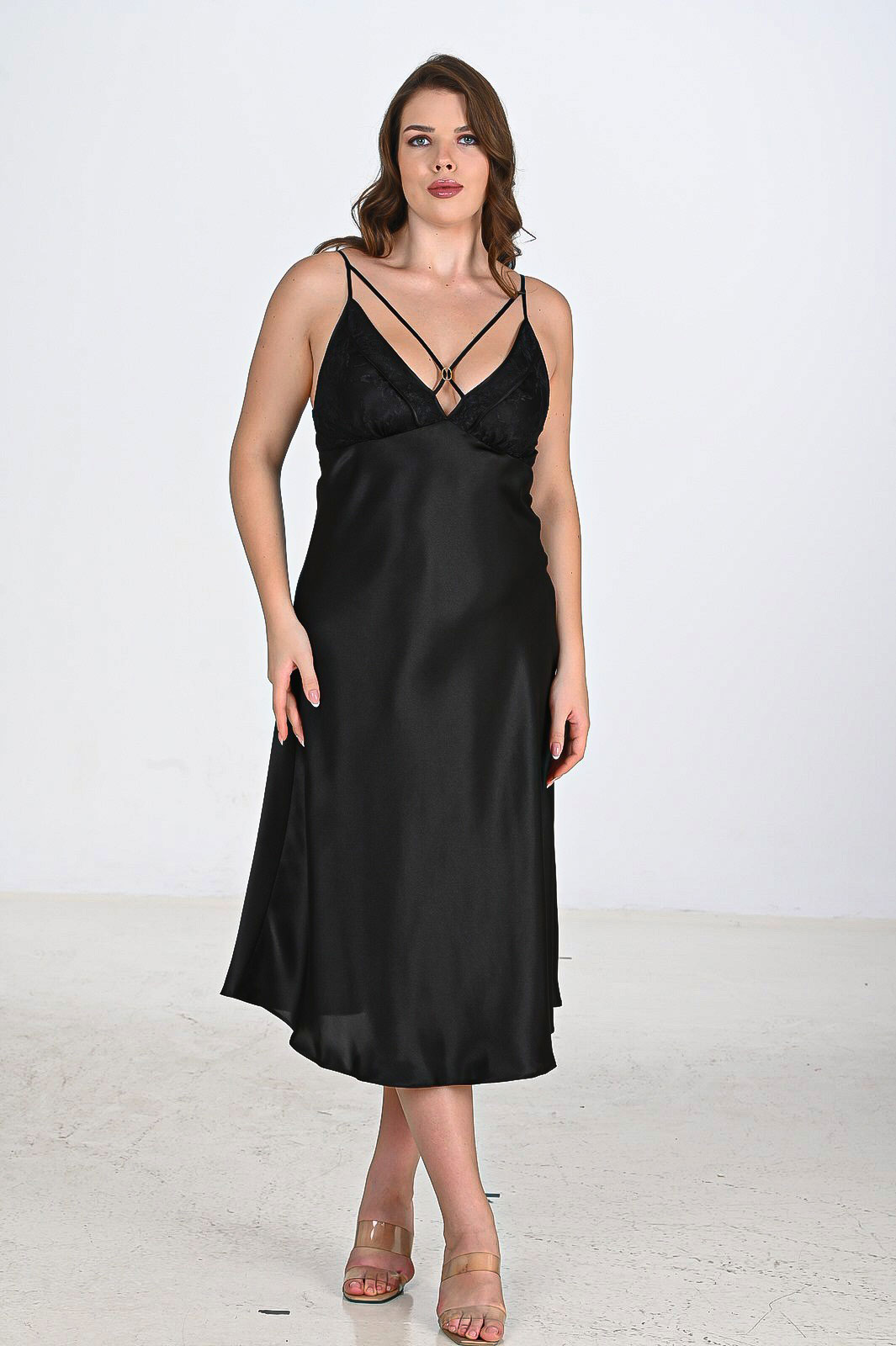 Klasik siyahın asaletini cesur detaylarla zirveye taşıyın! Büyük beden kadınlar için tasarlanan bu gecelik, lüks ve modern bir çekicilik sunuyor. Vücuda akıcı bir şekilde dökülen ipeksi siyah saten, teninizde kayarak asil bir parlaklık yaratır. Tasarımın odak noktası, göğsü vurgulayan ve ürüne iddia katan çapraz bantlı V yaka ve ortadaki halka detayıdır. Uzun kesimine rağmen, bacaktaki derin yırtmaç detayı ve etek ucundaki zarif dantel bitişleri tasarıma dinamik ve baştan çıkarıcı bir hava katar. Bu model, hem rahat hem de kendinizi güçlü ve unutulmaz hissetmek istediğiniz anlar için mükemmel bir seçimdir.